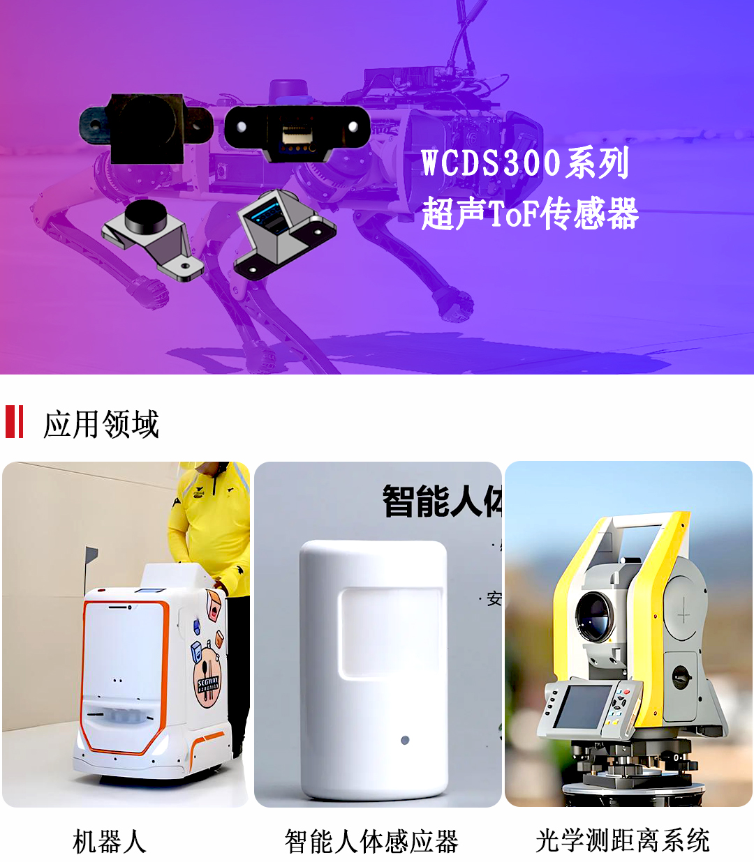 WCDS300系列超声ToF传感器测量距离为2/4m,精度为1mm,广泛在机器人避障、无人机避障、安防、人体感应、光学测距离系统等广泛应用。